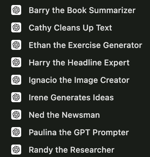 However! There are a million ways that ChatGPT can help you with the process of writing. This week, I’m going to highlight one of the ways - by creating an army of assistants, each with fun alliterative names. This was inspired by this episode of Beyond the Prompt hosted by